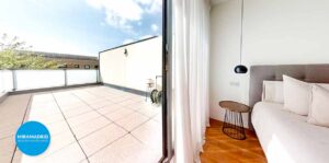 . Porche y Exterior: el salón se extiende hacia un porche privado, protegido por un toldo electrónico con sensor de viento, que permite regular la sombra de forma automática para disfrutar del exterior durante todo el año. Espacio perfecto para barbacoas o una comida en familia y/o amigos. Acceso desde el porche a la urbanización.
