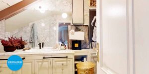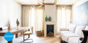 Continuamos la visita entrando en el salón, gracias a sus 2 balcones tiene mucha luz natural, uno a cada lado de la chimenea creando un ambiente muy acogedor. Las líneas rectas y puertas altas hacen de este espacio un sitio único para disfrutar del día a día y de las reuniones con amigos. Y en esta planta tenemos un amplio dormitorio con balcón y un baño completo.