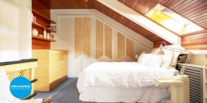 Subimos a la primera planta y lo hacemos por una preciosa escalera de madera maciza. Donde encontramos un espacio abierto, con un dormitorio con un gran vestidor y con un espacio de descanso, ocio y trabajo, que también tienen un grandísimo vestidor. El baño con ducha y bañera culminan esta planta.