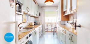 Empezamos la visita accediendo a la vivienda por el distribuidor y lo primero que nos llama la atención es un suelo de madera con una colocación en espiga, cocina totalmente amueblada con balcón muy coqueto donde caben 2 sillas para esos desayunos íntimos.