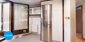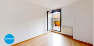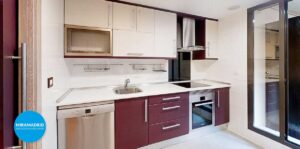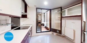 Entramos en una amplia cocina totalmente equipada y con electrodomésticos, la cual tiene una práctica terraza tendedero, desde donde accedemos a un patio de 20 m².
