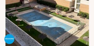 La urbanización ofrece zonas comunes; gran piscina exterior que tiene una pradera con sombrillas, gimnasio y sala social para reuniones.